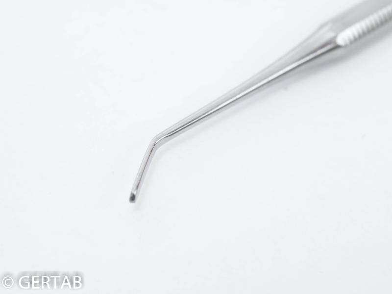 Dubbeländad pedikyrkrok med böjd och vinklad spets. Rostfri. För noggrann rengöring vid behandling.