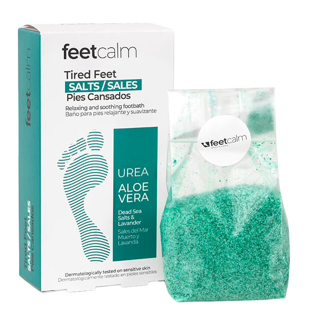 Feetcalm Fotsalt Trötta Fötter är ett avslappnande och vårdande fotsalt som kombinerar naturliga ingredienser för att mjukgöra och revitalisera trötta fötter. Formulerat med salter från Döda havet, urea, aloe vera, solrosolja, kamomill och lavendel, hjälper det till att mjukgöra förhårdnader och underlätta avlägsnandet av död hud. Produkten är dermatologiskt testad och passar även känslig hud.