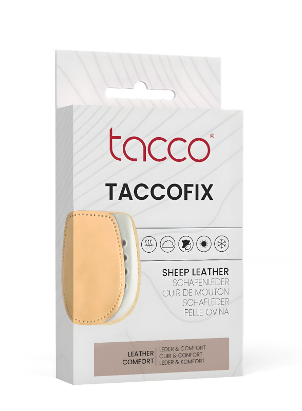 Taccofix är en bekväm hälkil som kombinerar tryckavlastning och höjdjustering i ett. Undersidan har ett mjukt RelaxFlex-lager som ger stötdämpning vid gång, medan ovansidan är täckt med ekologiskt behandlat fårskinn för ett behagligt klimat i skon. Produkten är självhäftande och håller sig stadigt på plats. Passar både kvinnor och män och kan användas i de flesta skotyper.