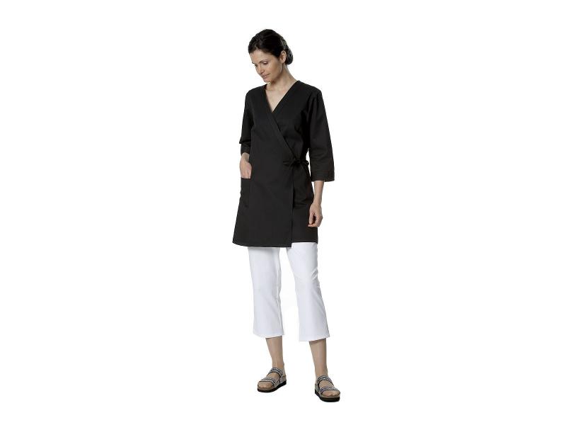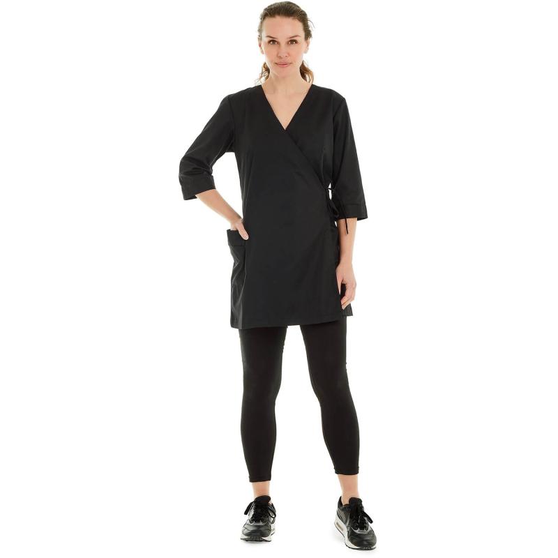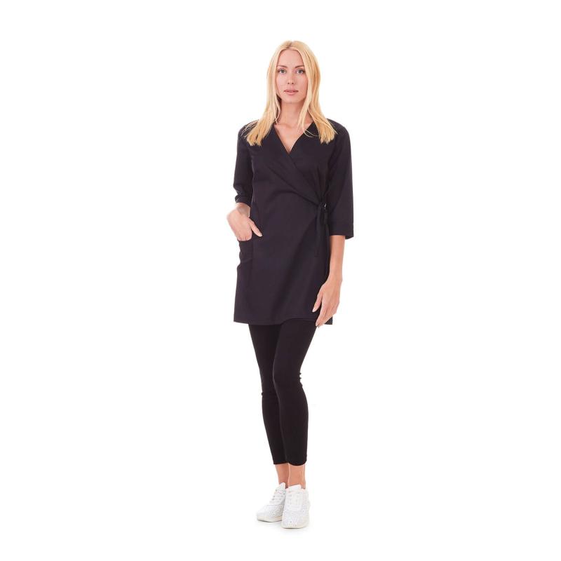 Isa Kimono är en stilren och insvängd kimonotunika med omlottknäppning och knytband för justerbar passform. Den har en ¾-ärm och en rymlig sidficka med dekorsömmar, vilket kombinerar funktion och stil.